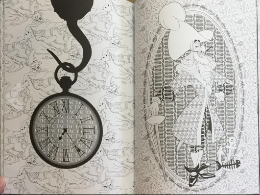 However, the cover image may be a bit misleading. Many of the drawings are filled with tiny, intricate but repetitive patterns. For me, rather disappointing coming from a studio that is packed with talented artists and illustrators. Another reviewer actually called then “painful” to look at and to color. Certainly the images can be frustrating, leaving you wondering what there is to even color in.