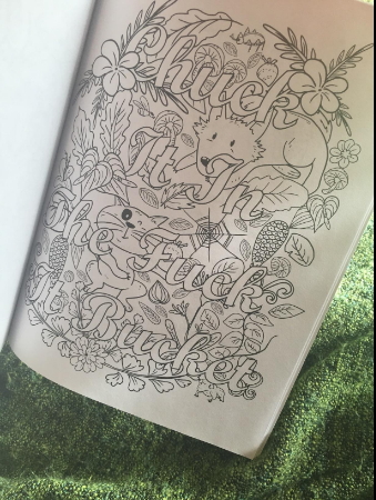 In the genre of swear word coloring books, this one is pretty entertaining. Filled with 39 irreverent phrases, there’s something for everyone (everyone you’d like to cuss out, that is). Some of the phrases are creatively quirky as well as rude: “Oh look… the fuck-up fairy has visited!” All are juxtaposed upon a scene of gardens, flowers and innocent little critters. Part of the fun is coloring in all that sweetness and light surrounding the over-the-top nastiness of the intertwined expressions.