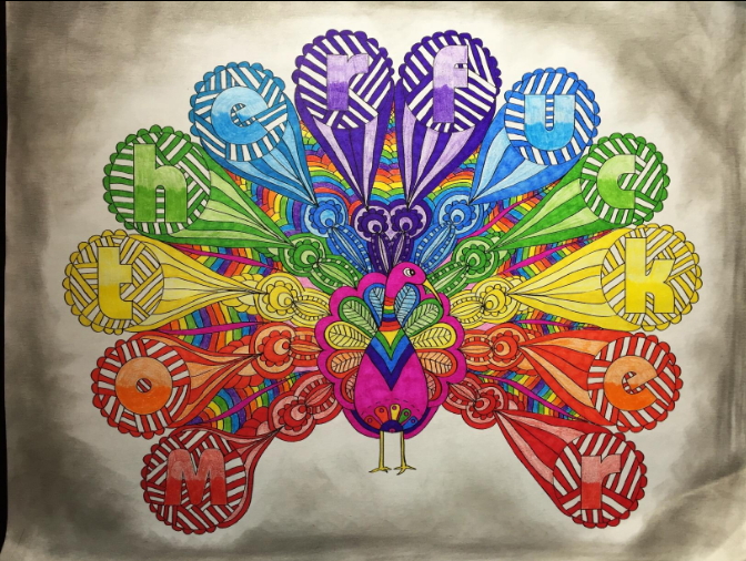 The swear words are fairly routine, but part of the fun is the way the letters are integrated into the animals so that the words aren’t necessarily obvious. Depending on your choice of color themes, you can create a captivating creature that does not immediately reveal what he has to say. The peacock below is a favorite a mine for just this reason. It can make coloring these images a lot more fun and interesting if you think about how to hide your secret message within the color scheme. (A finished drawing could make the perfect gift for a particularly dim-witted boss, now that I think about it).